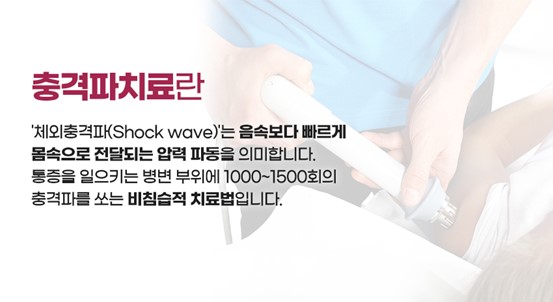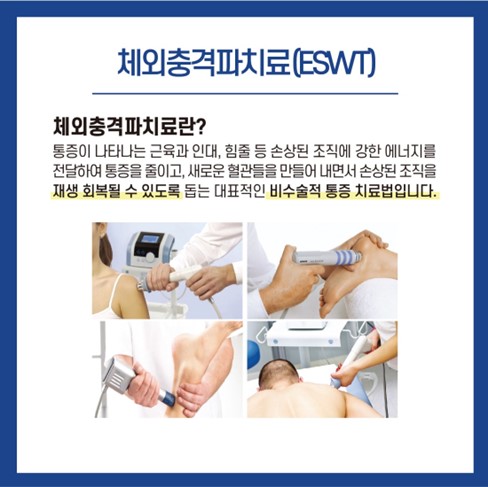 체외 충격파란 높은 에너지를 보유한 음향충격파를 말하는 것으로 영어로는 ESWT라고 하는데 Extracorporeal Shock Wave Therapy의 준말로 말그대로 체외 즉 몸 밖에서 가해주는 충격파를 이용한 치료방법으로, 체외에서 가해지는 에너지로 근골격계의 질환을 치료하는 것을 말합니다. 안전한 고충격 에너지를 병변부위에 집중 전달시켜 소염제, 국소주사치료, 재활치료 등으로도 호전되지 않는 관절 및 힘줄, 인대 손상을 원상 회복시켜주는 의료 신기술입니다.